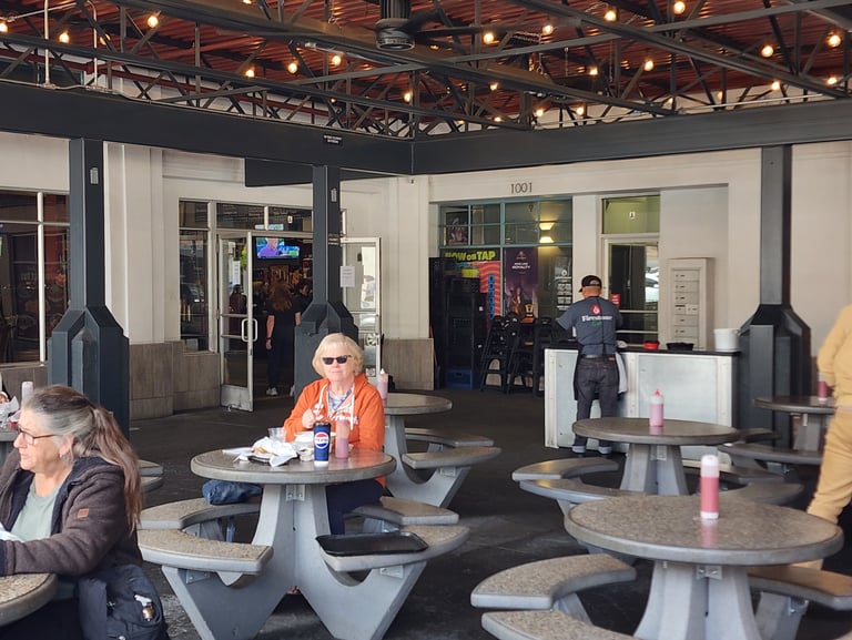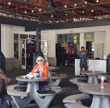 It was a relatively short drive to Avila Beach. It rained off and on as we passed through Santa Barbara and Santa Maria. In Avila Beach there is a working harbor complete with a boatyard, fishing boats, restaurants, and launching ramps. They have eight campsites right in the boatyard that overlook the harbor. There is also a dog-friendly beach that is very close by, making this a very optimal place for us to camp. We've camped here a handful of times before and we always look forward to our next visit. It is very relaxing with some enjoyable activities awaiting us. Our first order-of-business was to head up highway 101 a short ways to San Luis Obispo and have lunch at Firestone Grill. Firestone's makes the absolute best tri-tip sandwich we've ever had, and we've made it a tradition to always stop there when we are in the area.