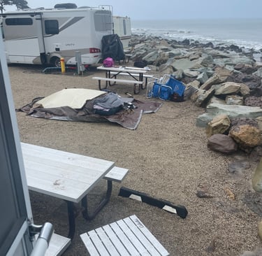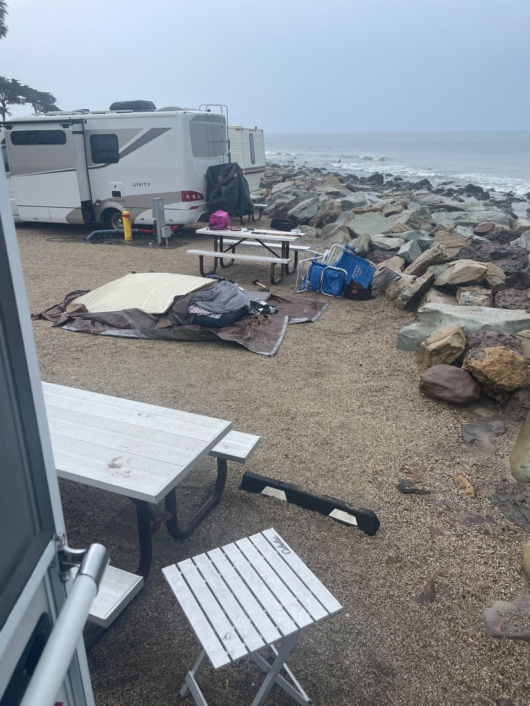 During our final night at Faria Beach the wind picked up and it started to rain. We were warm and dry in our trailer but the people in the next campsite were caught off guard. They had optimistically erected a screen room to sleep in, planning that the very pleasant weather we had been enjoying would continue. They must have gone off to have breakfast and get warm somewhere because they weren't around when a gust of wind blew their screen room away, leaving all their belongings uncovered. John retrieved their collapsed screen room from the rocks and laid it back on top of their belongings, along with a rock to weigh it down. We left shortly thereafter and never got the chance to explain to our neighbors what had happened.